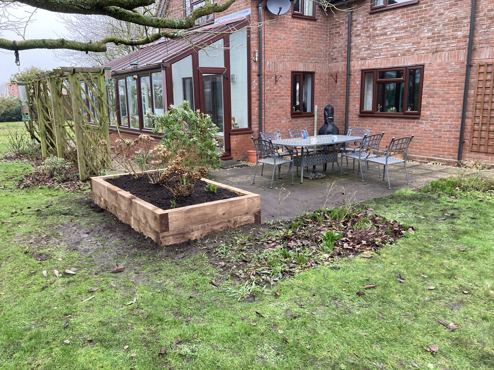 This part of the garden overshadowed by a massive Cherry tree needed neatening up. This raised bed will provide a nice deep base for plants to establish. These sleepers make the bed easy to manage, raising the height. Now we need to fill them!